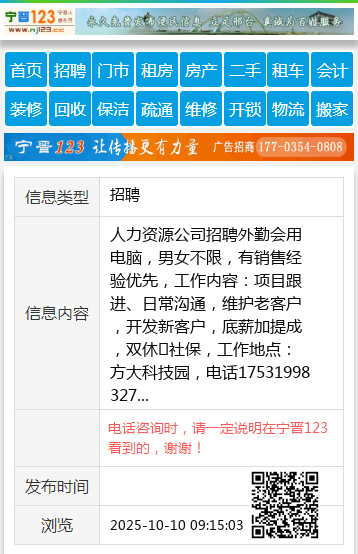 人力资源公司招聘外勤会用电脑,男女不限,有销售经验优先,工作内容:项目跟进、日常沟通,维护老客户,开发新客户,底薪加提成,双休➕社保,工作地点:方大科技园,电话17531998327