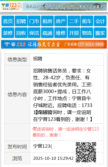 招聘销售话务员,要求:女性、28-42岁,负责任、有销售经验者优先录用。工资:底薪3000+提成,日工作八小时,工作地点:宁晋县牛仔城附近。应聘电话:17331159492