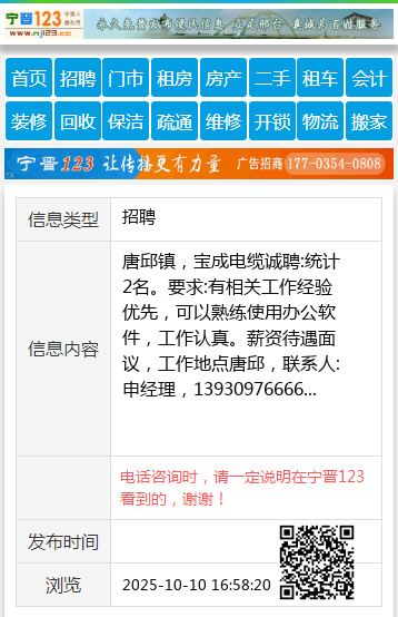 唐邱镇,宝成电缆诚聘:统计2名。要求:有相关工作经验优先,可以熟练使用办公软件,工作认真。薪资待遇面议,工作地点唐邱,联系人:申经理,13930976666 【电话咨询时,请一定说明在宁晋123看到的,谢谢!】 |