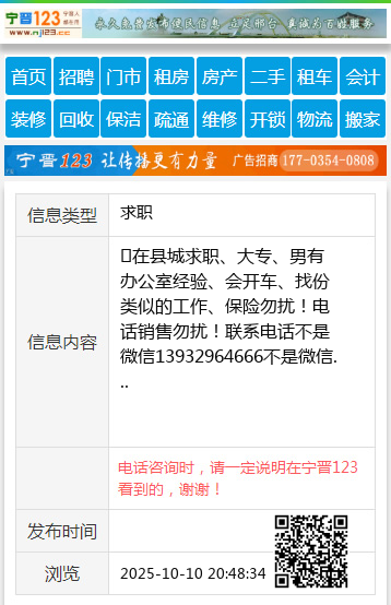 在县城求职、大专、男有办公室经验、会开车、找份类似的工作、保险勿扰!电话销售勿扰!联系电话不是微信13932964666不是微信 【电话咨询时,请一定说明在宁晋123看到的,谢谢!】 |