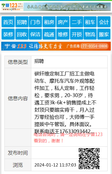 碳纤维定制工厂招工主做电动车、摩托车汽车外观等配件加工,私人定制,工作轻松,要求男,20-30岁,待遇工资3k-6k+销售提成上不封顶只要踏实肯干,月入过万零经验也可,大师傅一手提拔中午管饭。具体面议。联系电话王17633093442 【电话咨询时,请一定说明在宁晋123看到的,谢谢!】 |