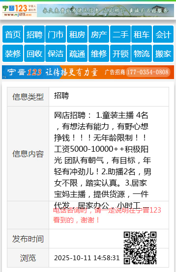 网店招聘: 1.童装主播 4名,有想法有能力,有野心想挣钱!!!无年龄限制!!工资5000-10000++积极阳光 团队有朝气,有目标,年轻有冲劲儿!2.助播2名,男女不限,踏实认真。3.居家宝妈主播,提供货源,一件代发,居家办公,小时工 有工作经验者优先录用!!!男女不限。地址:东亚 菜市场 大医院附近 县城 ,联系电话:15533197597 【电话咨询时,请一定说明在宁晋123看到的,谢谢!】 |