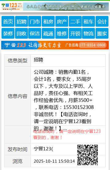 公司诚聘:销售内勤1名,会计1名,要求女,35周岁以下,大专及以上学历、人品好,责任心强、有相关工作经验者优先,月薪3500+,联系电话:15530152308非诚勿扰! 【电话咨询时,请一定说明在宁晋123看到的,谢谢!】 |