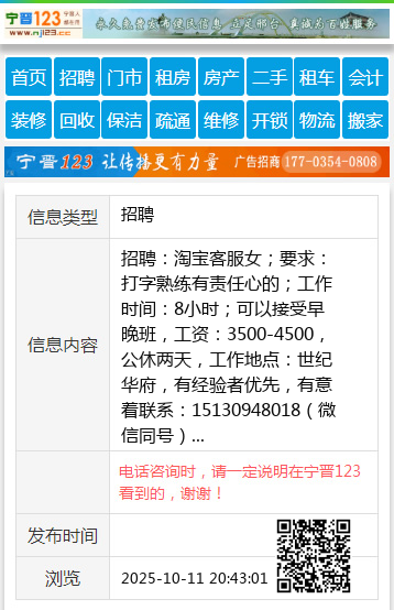 招聘:淘宝客服女;要求:打字熟练有责任心的;工作时间:8小时;可以接受早晚班,工资:3500-4500,公休两天,工作地点:世纪华府,有经验者优先,有意着联系:15130948018(微信同号)