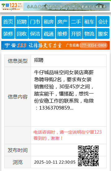 牛仔城品味空间女装店高薪急聘导购2名,要求有女装销售经验,30至45岁之间,踏实能干,懂搭配,想找一份安稳工作的联系我,电微:13363709859 【电话咨询时,请一定说明在宁晋123看到的,谢谢!】 |