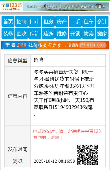 多多买菜招替班送货司机一名,不替班送货的时候上夜班分拣,要求男年龄35岁以下开车熟练吃苦耐劳有责任心一天工作6到8小时,一天150,有意联系15194932943微同 【电话咨询时,请一定说明在宁晋123看到的,谢谢!】 |