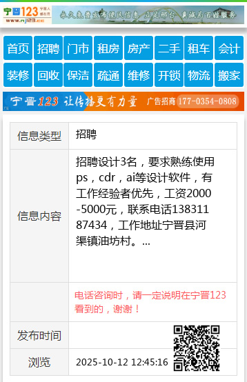 招聘设计3名,要求熟练使用ps,cdr,ai等设计软件,有工作经验者优先,工资2000-5000元,联系电话13831187434,工作地址宁晋县河渠镇油坊村。