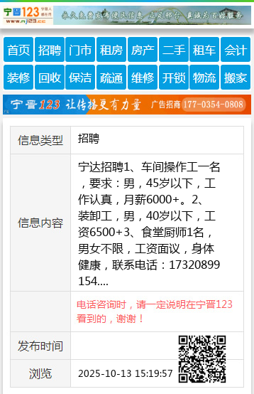 宁达招聘1、车间操作工一名,要求:男,45岁以下,工作认真,月薪6000+。2、装卸工,男,40岁以下,工资6500+3、食堂厨师1名,男女不限,工资面议,身体健康,联系电话:17320899154. 【电话咨询时,请一定说明在宁晋123看到的,谢谢!】 |