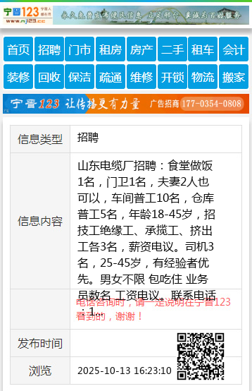 山东电缆厂招聘:食堂做饭1名,门卫1名,夫妻2人也可以,车间普工10名,仓库普工5名,年龄18-45岁,招技工绝缘工、承揽工、挤出工各3名,薪资电议。司机3名,25-45岁,有经验者优先。男女不限 包吃住 业务员数名 工资电议。联系电话:13675411866/15031941667 【电话咨询时,请一定说明在宁晋123看到的,谢谢!】 |