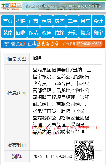 晶龙集团招聘会计/出纳、工程审核员;医养公司招聘行政专员、市场专员、市场经营部经理;晶龙地产物业公司招聘工程项目经理、兴和副总经理、商旅公司经理、水电监审员、消防中控员;晶龙餐饮公司招聘安全质检经理、人事经理、采购员;晶龙大酒店招聘餐厅经理、厨师长、烘焙运营经理;晶龙物流公司招聘进出口操作主管,岗位多多,有意者电话联系:03195856130 【电话咨询时,请一定说明在宁晋123看到的,谢谢!】 |