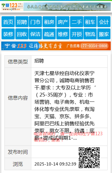 天津七星华控自动化仪表宁晋分公司,诚聘电商销售若干.要求:大专及以上学历‘(25-35周岁),专业:市场营销、电子商务、机电一体化等专业优先录取,有淘宝、天猫、京东、拼多多、阿里巴巴线上销售经验优先录取,男女不限。待遇:底薪+提成试用期1-3个月.3000/月+提成.要求踏实肯干,有上进心..每天工作八个小时,五险.节假日全休.实行单双休,工作地点:方大科技园,如有想法可以与我们联系,联系电话:13752055332刘经理.17867425860罗经理 【电话咨询时,请一定说明在宁晋123看到的,谢谢!】 |