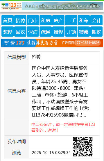 国企中国人寿招录售后服务人员、人事专员、医保宣传员,年龄25-45周,男女不限待遇3000~8000+津贴+三险+单休+旅游,6小时工作制,不耽误接送孩子有需要找工作或想换工作的电话:13784925906微信同号 【电话咨询时,请一定说明在宁晋123看到的,谢谢!】 |