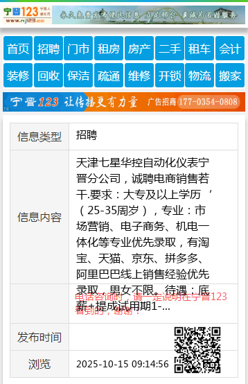 天津七星华控自动化仪表宁晋分公司,诚聘电商销售若干.要求:大专及以上学历‘(25-35周岁),专业:市场营销、电子商务、机电一体化等专业优先录取,有淘宝、天猫、京东、拼多多、阿里巴巴线上销售经验优先录取,男女不限。待遇:底薪+提成试用期1-3个月.3000/月+提成.要求踏实肯干,有上进心..每天工作八个小时,五险.节假日全休.实行单双休,工作地点:方大科技园,如有想法可以与我们联系,联系电话:13752055332刘经理.17867425860罗经理, 【电话咨询时,请一定说明在宁晋123看到的,谢谢!】 |