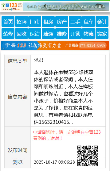 本人退休在家我55岁想找双休的保洁或者保姆,本人住颐和明珠附近,本人在样板间做过保洁,也看过好几个小孩子,价格好商量本人不是为了挣钱,是在家真的没意思,有意者请和我联系电话15632310415 【电话咨询时,请一定说明在宁晋123看到的,谢谢!】 |