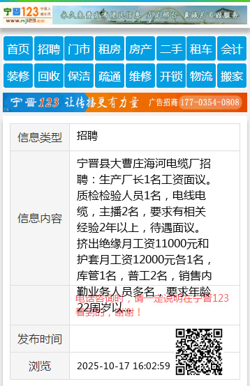宁晋县大曹庄海河电缆厂招聘:生产厂长1名工资面议。质检检验人员1名,电线电缆,主播2名,要求有相关经验2年以上,待遇面议。挤出绝缘月工资11000元和护套月工资12000元各1名,库管1名,普工2名,销售内勤业务人员多名,要求年龄22周岁以上--50周岁以下。入职后可以缴社保。联系电话:13171859557电话5567077 【电话咨询时,请一定说明在宁晋123看到的,谢谢!】 |