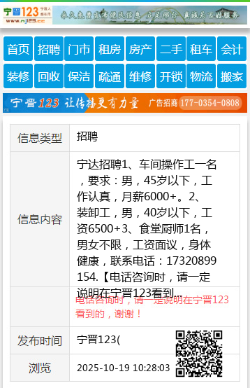 宁达招聘1、车间操作工一名,要求:男,45岁以下,工作认真,月薪6000+。2、装卸工,男,40岁以下,工资6500+3、食堂厨师1名,男女不限,工资面议,身体健康,联系电话:17320899154. 【电话咨询时,请一定说明在宁晋123看到的,谢谢!】 |
