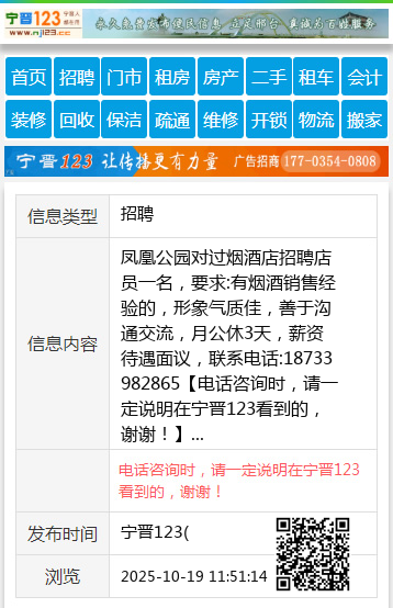 凤凰公园对过烟酒店招聘店员一名,要求:有烟酒销售经验的,形象气质佳,善于沟通交流,月公休3天,薪资待遇面议,联系电话:18733982865 【电话咨询时,请一定说明在宁晋123看到的,谢谢!】 |