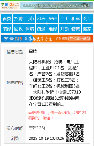大陆村机械厂招聘:电气工程师,主业PLC1名,质检1名;库管2名;发货客服1名;组装工5名;打包工5名;车间女工2名;机械制图3名;大陆村附近!电话15731933399;13513197483