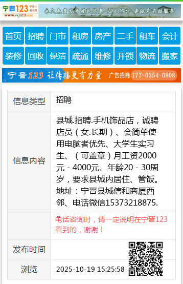 县城.招聘.手机饰品店,诚聘店员(女.长期)、会简单使用电脑者优先、大学生实习生、(可盖章)月工资2000元-4000元、年龄20-30周岁,要求县城内居住、管饭。地址:宁晋县城信和商厦西邻、电话微信15373218875 【电话咨询时,请一定说明在宁晋123看到的,谢谢!】 |