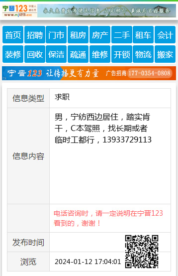 男,宁纺西边居住,踏实肯干,C本驾照,找长期或者临时工都行,13933729113
