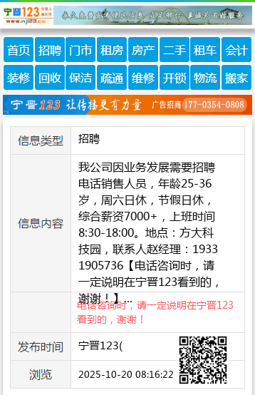 我公司因业务发展需要招聘电话销售人员,年龄25-36岁,周六日休,节假日休,综合薪资7000+,上班时间8:30-18:00。地点:方大科技园,联系人赵经理:19331905736 【电话咨询时,请一定说明在宁晋123看到的,谢谢!】 |