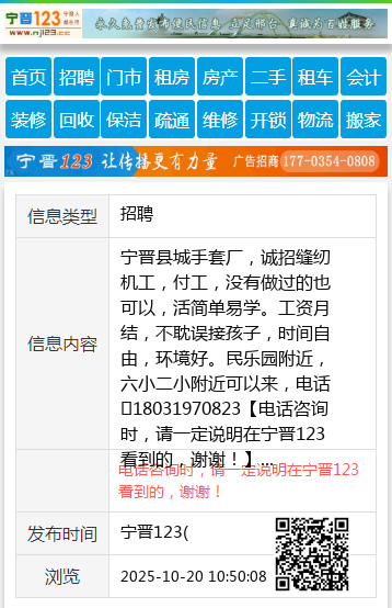 宁晋县城手套厂,诚招缝纫机工,付工,没有做过的也可以,活简单易学。工资月结,不耽误接孩子,时间自由,环境好。民乐园附近,六小二小附近可以来,电话☎18031970823 【电话咨询时,请一定说明在宁晋123看到的,谢谢!】 |