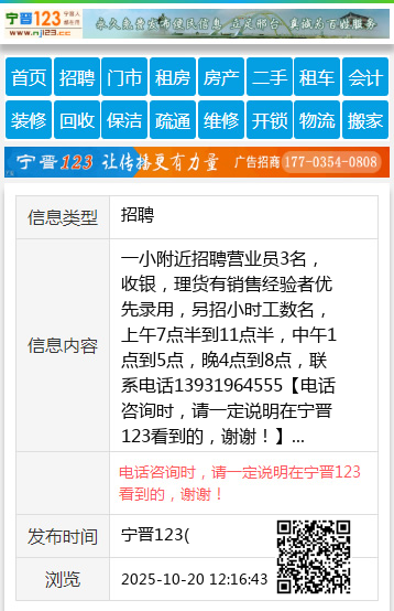 一小附近招聘营业员3名,收银,理货有销售经验者优先录用,另招小时工数名,上午7点半到11点半,中午1点到5点,晚4点到8点,联系电话13931964555 【电话咨询时,请一定说明在宁晋123看到的,谢谢!】 |