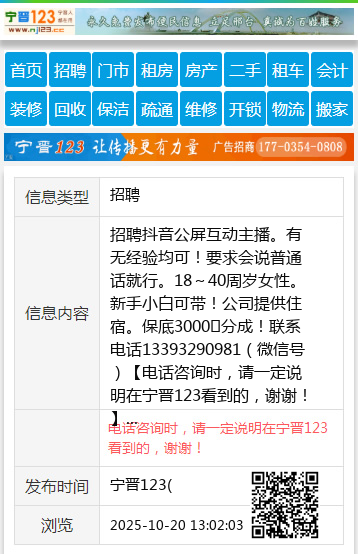 招聘抖音公屏互动主播。有无经验均可!要求会说普通话就行。18~40周岁女性。新手小白可带!公司提供住宿。保底3000➕分成!联系电话13393290981(微信号) 【电话咨询时,请一定说明在宁晋123看到的,谢谢!】 |
