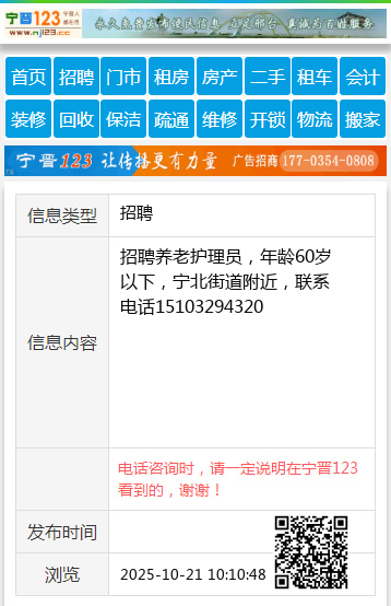 招聘养老护理员,年龄60岁以下,宁北街道附近,联系电话15103294320