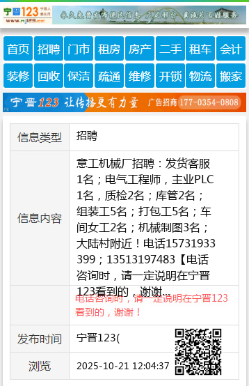 意工机械厂招聘:发货客服1名;电气工程师,主业PLC1名,质检2名;库管2名;组装工5名;打包工5名;车间女工2名;机械制图3名;大陆村附近!电话15731933399;13513197483 【电话咨询时,请一定说明在宁晋123看到的,谢谢!】 |