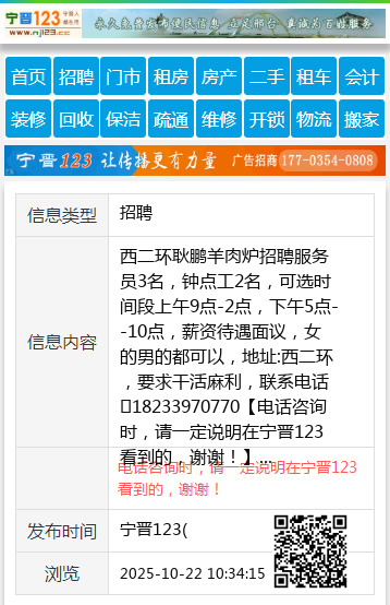 西二环耿鹏羊肉炉招聘服务员3名,钟点工2名,可选时间段上午9点-2点,下午5点--10点,薪资待遇面议,女的男的都可以,地址:西二环,要求干活麻利,联系电话18233970770 【电话咨询时,请一定说明在宁晋123看到的,谢谢!】 |