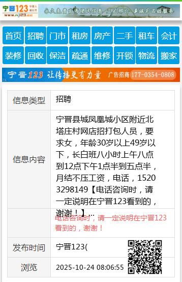 宁晋县城凤凰城小区附近北塔庄村网店招打包人员,要求女,年龄30岁以上49岁以下,长白班八小时上午八点到12点下午1点半到五点半,月结不压工资,电话,15203298149 【电话咨询时,请一定说明在宁晋123看到的,谢谢!】 |