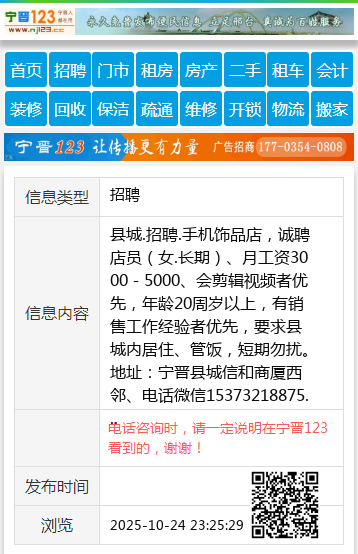 县城.招聘.手机饰品店,诚聘店员(女.长期)、月工资3000-5000、会剪辑视频者优先,年龄20周岁以上,有销售工作经验者优先,要求县城内居住、管饭,短期勿扰。地址:宁晋县城信和商厦西邻、电话微信15373218875 【电话咨询时,请一定说明在宁晋123看到的,谢谢!】 |