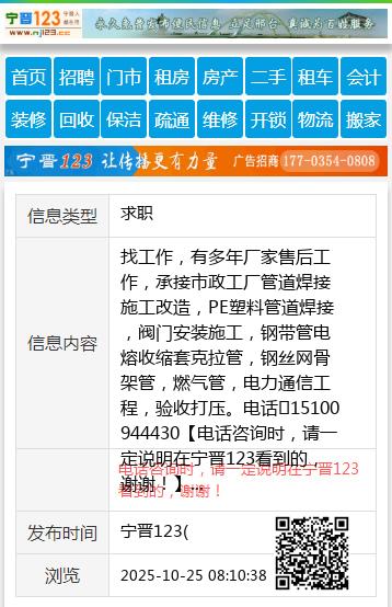 找工作,有多年厂家售后工作,承接市政工厂管道焊接施工改造,PE塑料管道焊接,阀门安装施工,钢带管电熔收缩套克拉管,钢丝网骨架管,燃气管,电力通信工程,验收打压。电话15100944430 【电话咨询时,请一定说明在宁晋123看到的,谢谢!】 |