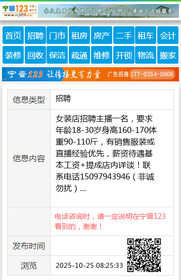 女装店招聘主播一名,要求年龄18-30岁身高160-170体重90-110斤,有销售服装或直播经验优先,薪资待遇基本工资+提成店内详谈!联系电话15097943946(非诚勿扰) 【电话咨询时,请一定说明在宁晋123看到的,谢谢!】 |