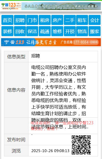 电缆公司招聘办公室文员内勤一名,熟练使用办公软件做统计,灵活会变通,性格开朗,大专学历以上,有文员内勤工作经验者优先,熟悉电缆的优先录用,有经验上手快学历可适当放低,有结婚生育计划的请止步,招聘长期稳定的搭档,双休,法定节假日休息,上班时间8:30-12:00下午:13:30-5:00地址交警队附近联系电话15130923375 【电话咨询时,请一定说明在宁晋123看到的,谢谢!】 |