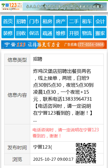 炸鸡汉堡店招聘出餐员两名,线上接单,两班,白班9点30到5点30,夜班5点30到凌晨1点30,一个夜班+15元,联系电话13833964731 【电话咨询时,请一定说明在宁晋123看到的,谢谢!】 |