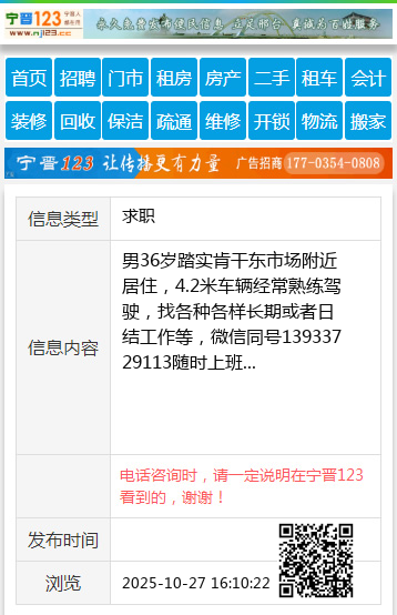 男36岁踏实肯干东市场附近居住,4.2米车辆经常熟练驾驶,找各种各样长期或者日结工作等,微信同号13933729113随时上班 【电话咨询时,请一定说明在宁晋123看到的,谢谢!】 |