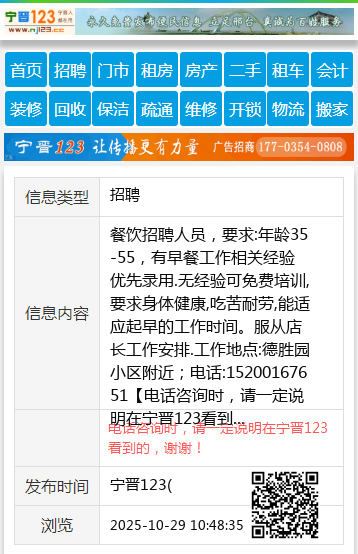 餐饮招聘人员,要求:年龄35-55,有早餐工作相关经验优先录用.无经验可免费培训,要求身体健康,吃苦耐劳,能适应起早的工作时间。服从店长工作安排.工作地点:德胜园小区附近;电话:15200167651 【电话咨询时,请一定说明在宁晋123看到的,谢谢!】 |