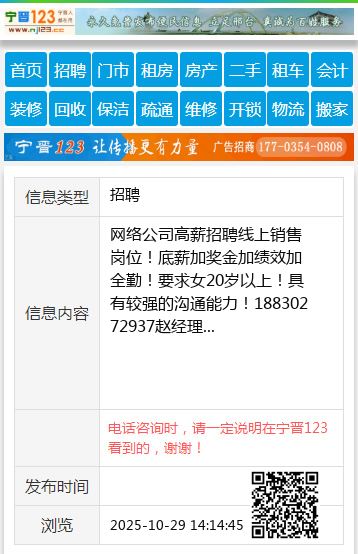 网络公司高薪招聘线上销售岗位!底薪加奖金加绩效加全勤!要求女20岁以上!具有较强的沟通能力!18830272937赵经理 【电话咨询时,请一定说明在宁晋123看到的,谢谢!】 |