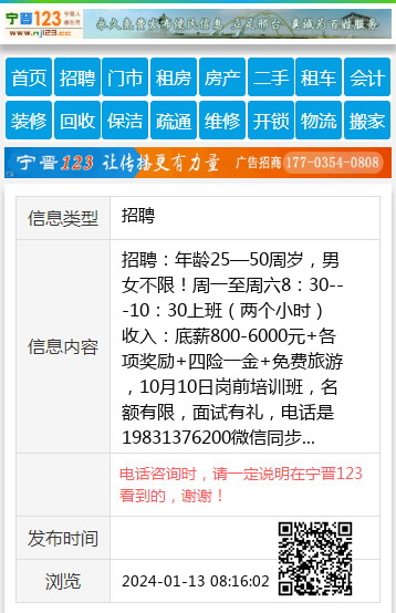 招聘:年龄25—50周岁,男女不限!周一至周六8:30---10:30上班(两个小时)收入:底薪800-6000元+各项奖励+四险一金+免费旅游,10月10日岗前培训班,名额有限,面试有礼,电话是19831376200微信同步 【电话咨询时,请一定说明在宁晋123看到的,谢谢!】 |