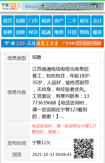 江苏南通电线电缆仓库急招普工,包吃包住,年龄18岁-35岁,人品好,能吃苦耐劳,无纹身,有经验者优先。工资面议,有意向联系:13773639688 【电话咨询时,请一定说明在宁晋123看到的,谢谢!】 |