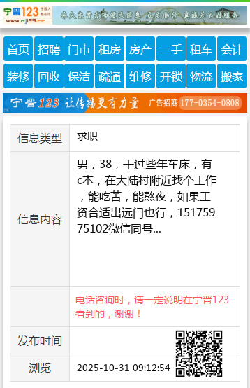 男,38,干过些年车床,有c本,在大陆村附近找个工作,能吃苦,能熬夜,如果工资合适出远门也行,15175975102微信同号 【电话咨询时,请一定说明在宁晋123看到的,谢谢!】 |