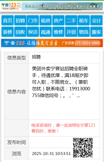 美团外卖宁晋站招聘全职骑手,待遇优厚,满18周岁即可入职,不限男女。(兼职勿扰)联系电话:19913000755微信同号;。,’ 【电话咨询时,请一定说明在宁晋123看到的,谢谢!】 |
