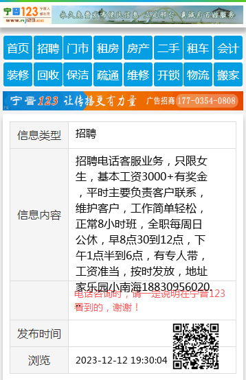 招聘电话客服业务,只限女生,基本工资3000+有奖金,平时主要负责客户联系,维护客户,工作简单轻松,正常8小时班,全职每周日公休,早8点30到12点,下午1点半到6点,有专人带,工资准当,按时发放,地址家乐园小南海18830956020 【电话咨询时,请一定说明在宁晋123看到的,谢谢!】 |