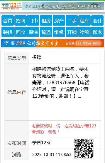 招聘物流倒货工两名,要求有物流经验,退伍军人,会开车, 电话:13831976668