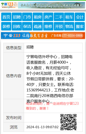 宁晋电信外呼中心,招聘电话客服数名,月薪4000+,收入稳定,有无经验均可,8个小时无加班,四天公休节假日带薪休假,要求:20-40岁,只要女士。联系电话:15369944213,工作地点:老二院南行20米路西电信总部客户服务中心 【电话咨询时,请一定说明在宁晋123看到的,谢谢!】 |