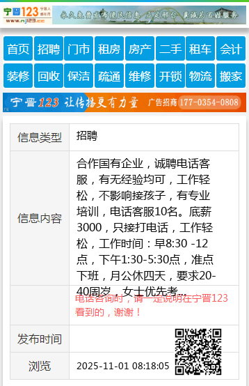 合作国有企业,诚聘电话客服,有无经验均可,工作轻松,不影响接孩子,有专业培训,电话客服10名。底薪3000,只接打电话,工作轻松,工作时间:早8:30 -12点,下午1:30-5:30点,准点下班,月公休四天,要求20-40周岁,女士优先考虑,工作简单,有无经验均可,长白班,地址:老车站附近 联系电话15731177212,名额有限,有意向请联系,20岁以下免打扰。 |