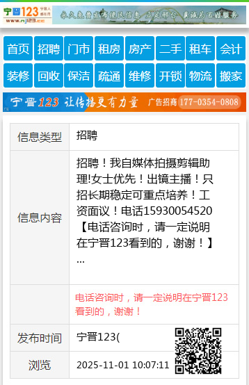 招聘!我自媒体拍摄剪辑助理!女士优先!出镜主播!只招长期稳定可重点培养!工资面议!电话15930054520