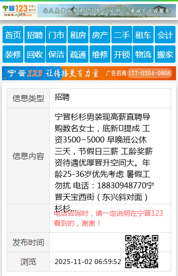 宁晋杉杉男装现高薪直聘导购数名女士,底新➕提成 工资3500−5000 早晚班公休三天,节假日三薪 工龄奖薪资待遇优厚晋升空间大。年龄25-36岁优先考虑 暑假工勿扰 电话:18830948770宁晋天宝西街(东兴斜对面)杉杉